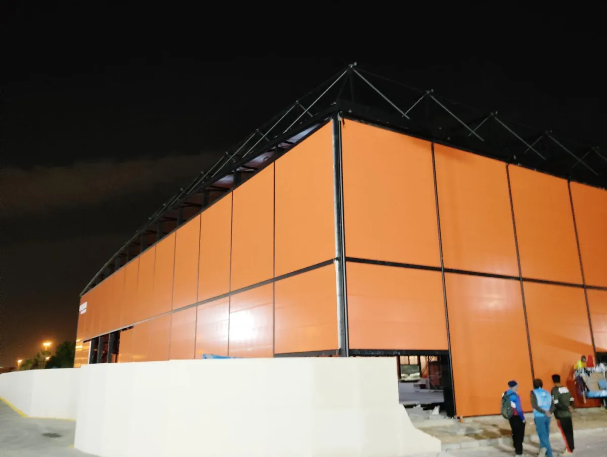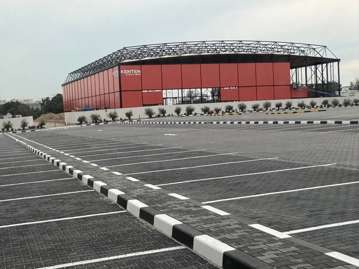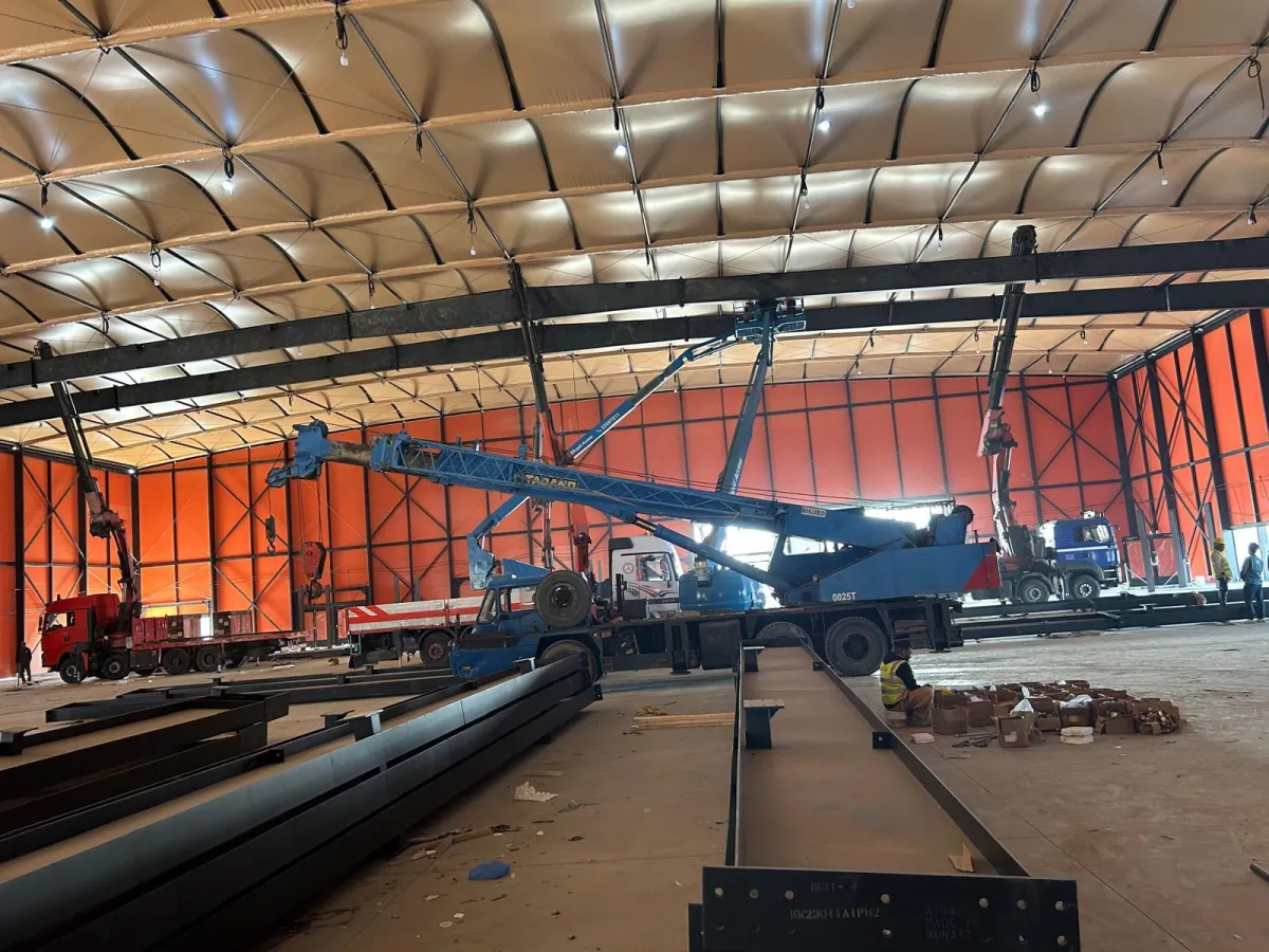 عملية رفع سقف وتركيب حوائط لمشروع قاعة متعددة الأغراض في منطقة صبحان، بمساحة 5000 متر مربع وارتفاع 15 متراً.